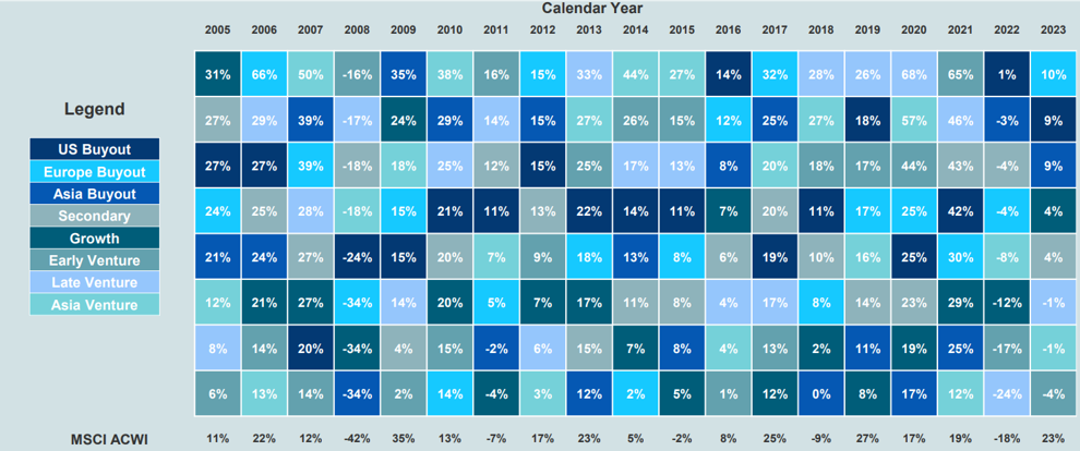 Source: MSCI Private Capital Solutions net LP pooled returns as of December 31, 2023, S&P Capital IQ. Past performance is not a reliable indicator of future results.