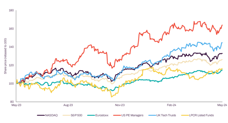 The chart below shows the progress over the last year of various indices, compared to listed PE funds, listed US PE managers and UK listed technology investment companies. While the US indices and listed managers have performed very strongly, share prices of the listed PE funds have been relatively weak, despite the strong performance of underlying portfolios in many cases.